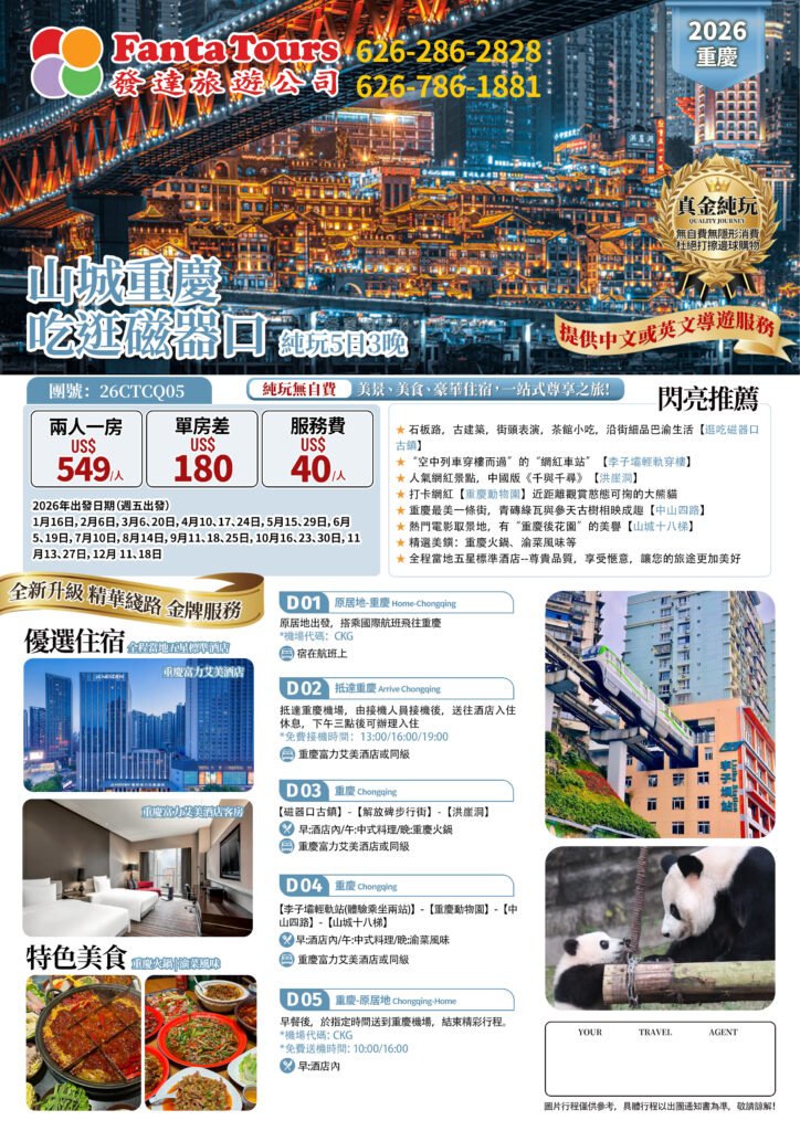26CTCQ05: Mountain City Chongqing, Explore & Dine at Ciqikou (Pure Sightseeing) (5 Days, 3 Nights) (Chinese & English) — 发达-26CTCQ05 山城重慶 吃逛磁器口 純玩5日3晚(中英)By /