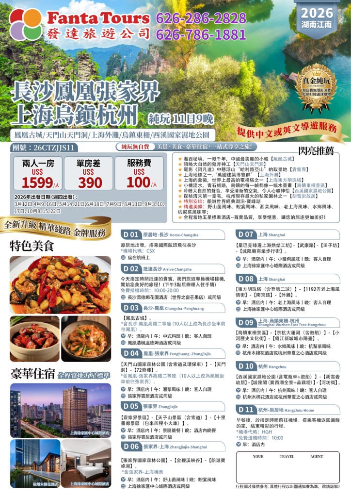 26CTZJJS11 Changsha, Fenghuang, Zhangjiajie — Shanghai, Wuzhen, Hangzhou (Pure Sightseeing) (11 Days, 9 Nights) — 26CTZJJS11 長沙鳳凰張家界 上海烏鎮杭州 純玩11日9晚By /