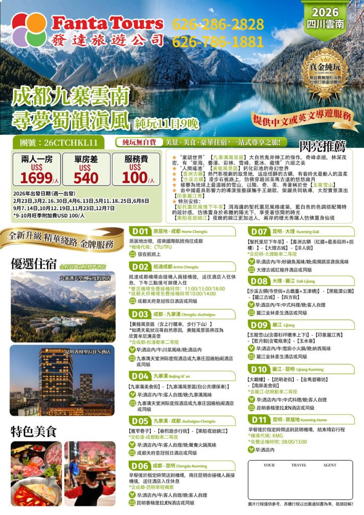 Chengdu Jiuzhaigou Yunnan: A Dream of Sichuan and Yunnan Charm Pure Tour (6CTCHKL11 ) ( 11 Days, 9 Nights) – 发达-26CTCHKL11 成都九寨雲南 尋夢蜀韻滇風 純玩11日9晚(中英)By /