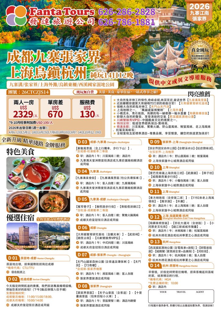 Chengdu, Jiuzhaigou, Zhangjiajie; Shanghai, Wuzhen, Hangzhou — Pure Sightseeing (26CTCZJS14 ) (14 Days, 12 Nights) – 26CTCZJS14 成都九寨張家界 上海烏鎮杭州 純玩14日12晚By /