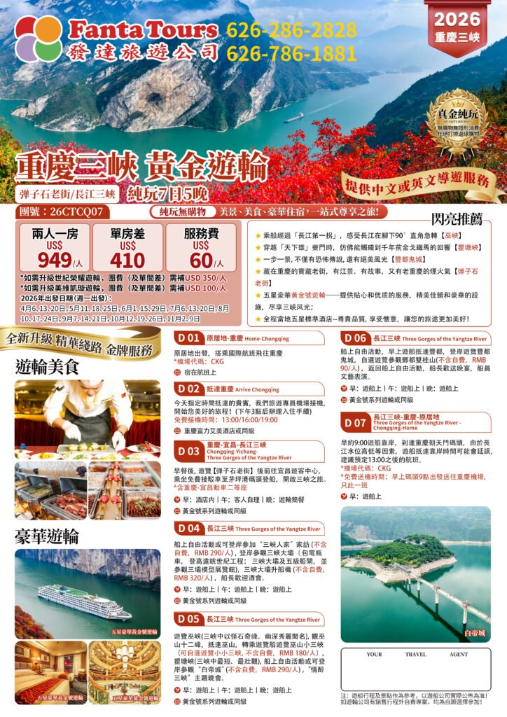 Chongqing Three Gorges Golden Cruise All-Inclusive Tour (26CTCQ07) (7 Days, 5 Nights) – 26CTCQ07 重庆三峡 黃金遊輪 純玩7日5晚By /