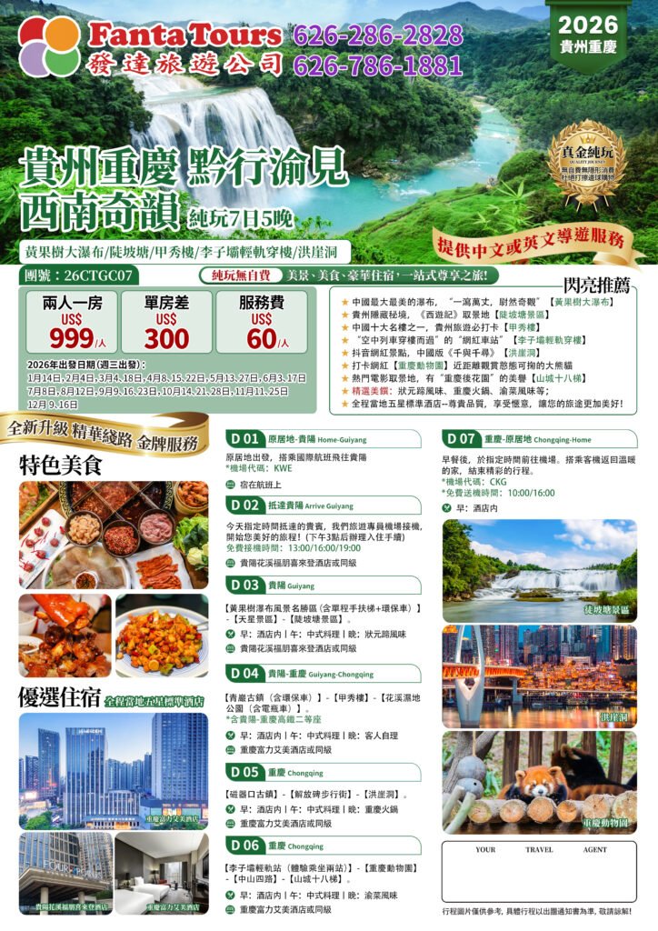 Guizhou and Chongqing: All-inclusive Tour Showcasing the Wonders of Southwest China (26CTGC07) (7 Days, 5 Nights) – 26CTGC07 貴州重慶 黔行渝見 西南奇韻 純玩7日5晚By /