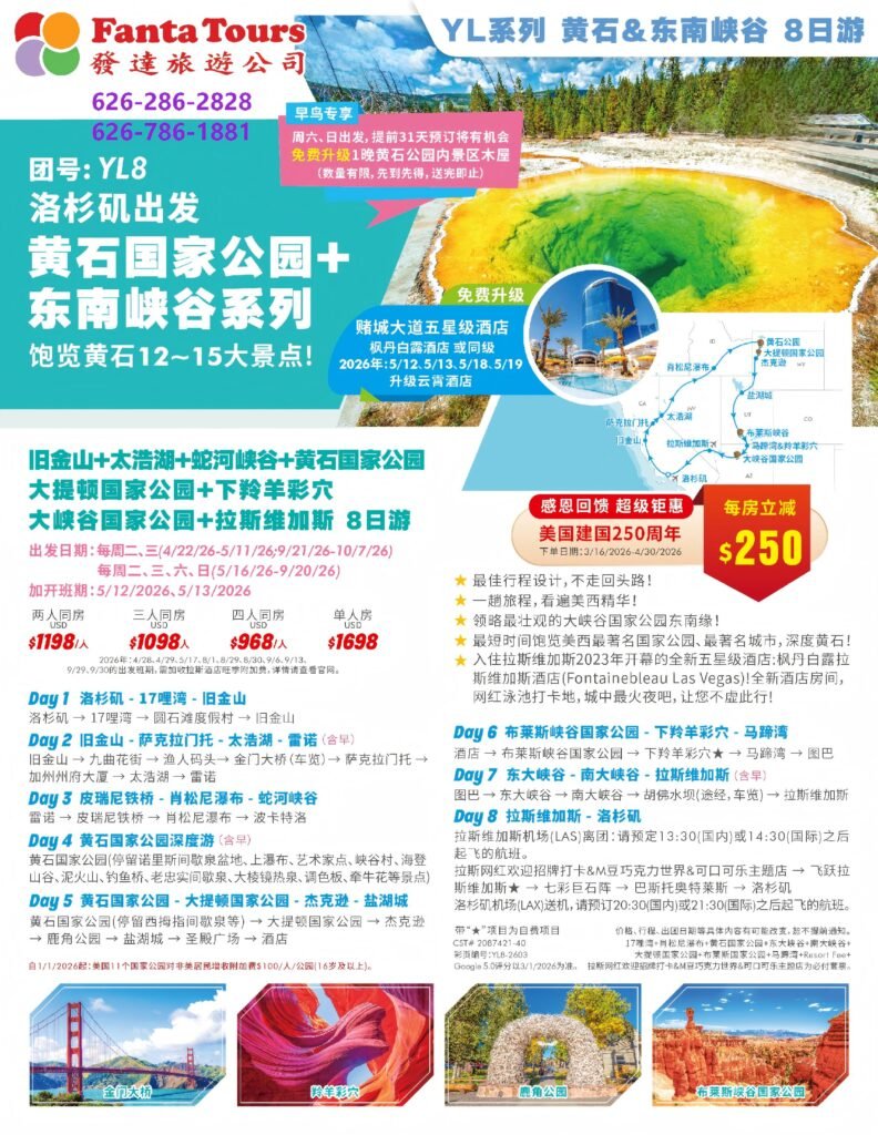 YL8: Yellowstone & Southeast Canyons Tour (Departing from Los Angeles) (8 Days) — 洛杉矶出发 YL8 黄石&东南峡谷 8日游By /
