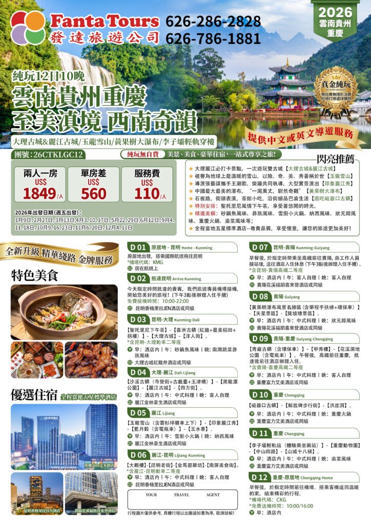 Yunnan, Guizhou, Chongqing: The Most Beautiful Yunnan Scenery, The Unique Charm of Southwest China All-Inclusive Tour (26CTKLGC12 ) (12 Days, 10 Nights) – 26CTKLGC12 雲南貴州重慶 至美滇境 西南奇韻 純玩12日10晚By /